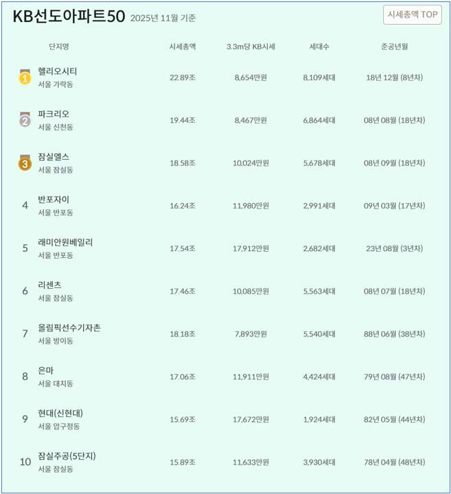 KB선도아파트50. ⒸKB부동산 자료