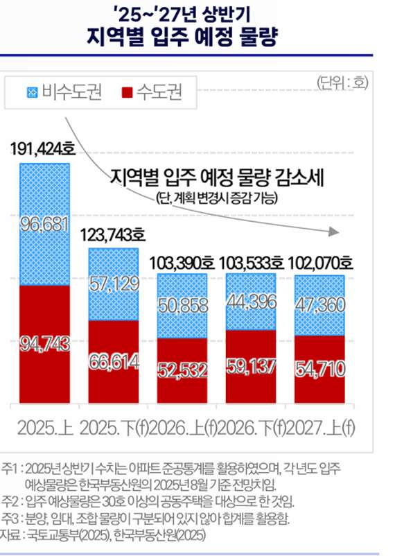 '25년~'27년 상반기 지역별 입주 예정 물량. Ⓒ한국건설산업연구원