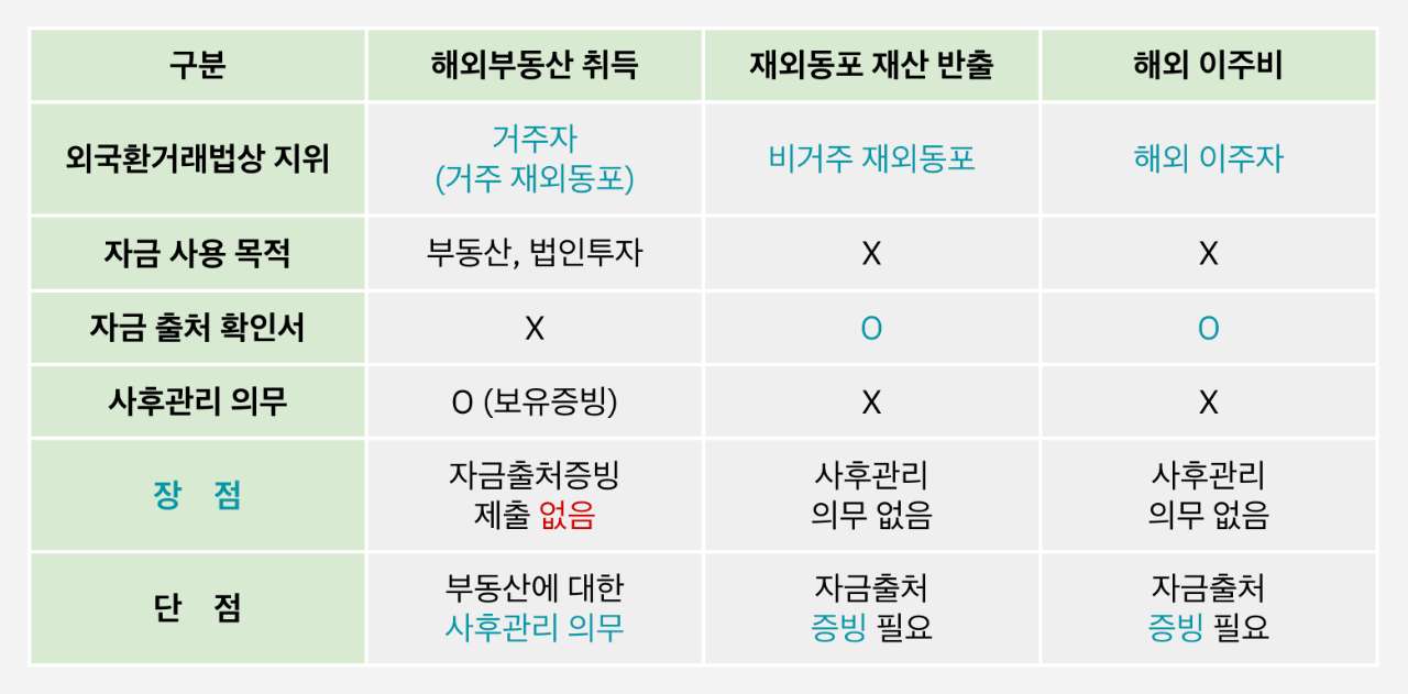 해외부동산 취득방식은 거주 재외동포가 사용할 수 있는 방법입니다. 자금 사용 목적이 부동산이나 법인투자로 명확히 제한되지만, 자금출처확인서를 제출할 필요가 없어 절차가 간편합니다. 대신 부동산을 보유하는 동안 지속적인 사후관리 의무를 져야 합니다.