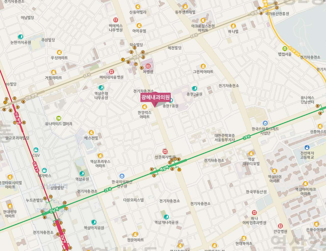 논현로 대로변에 접한 입지로, 대중교통 접근성 또한 우수한 광혜내과의원 터 Ⓒ국토지리정보원