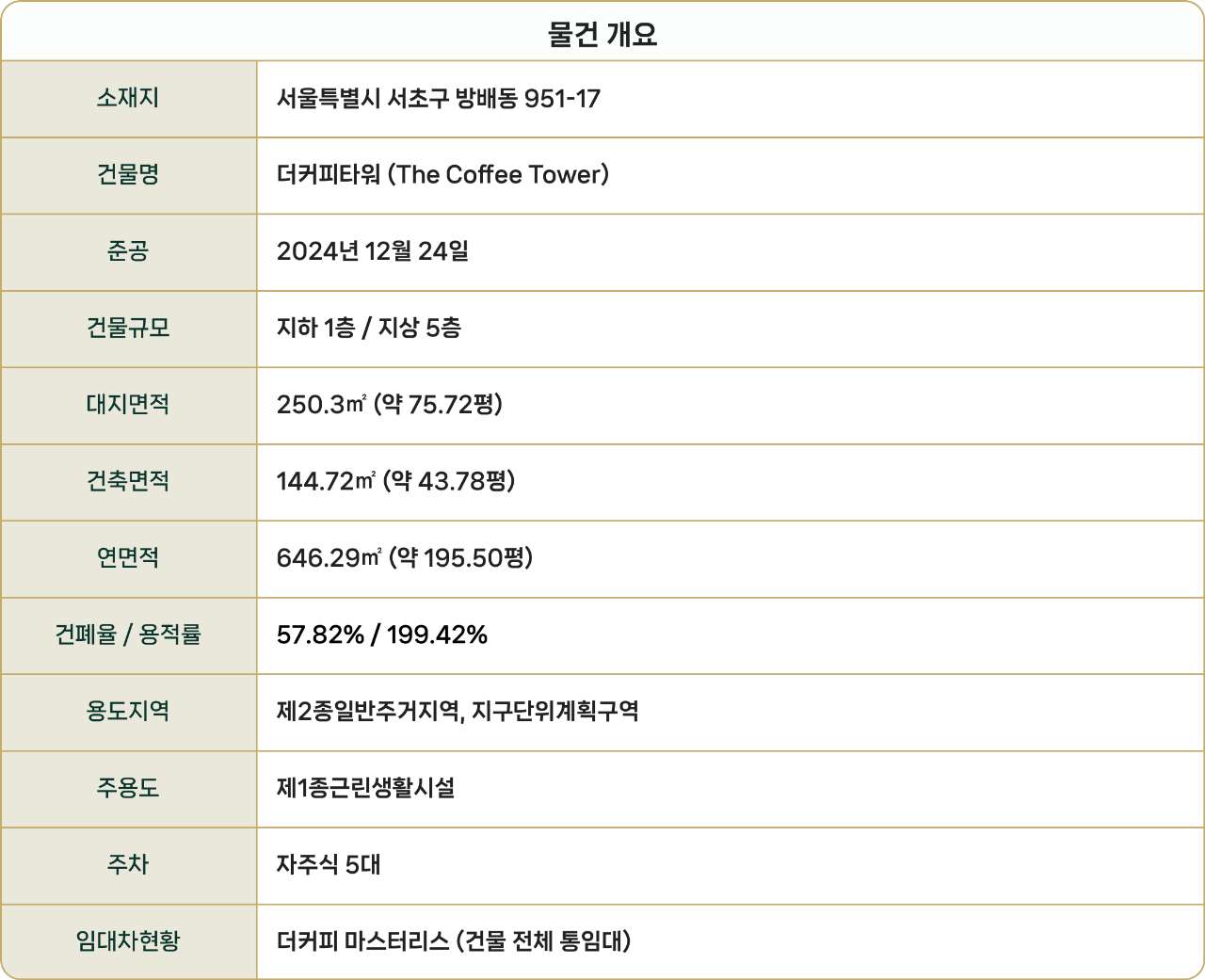 더커피타워는 2024년 12월 신축된 철근콘크리트조 건물입니다. 대지면적 250.3㎡(75.72평), 연면적 646.29㎡(195.50평), 지하 1층~지상 5층 구조로, 글로벌 커피 브랜드 더커피가 전층을 본사 사옥 겸 플래그십 매장으로 장기 임차중입니다.