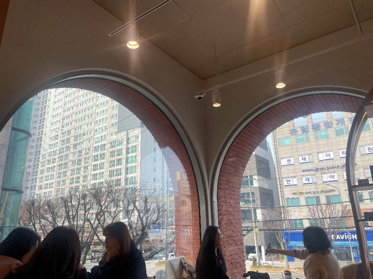흔히 볼 수 있는 도심의 풍경이 아치형 창을 통해 편안함을 제공한다. 카페의 창가자리는 늘 선호되는 자리이다. ©안명숙