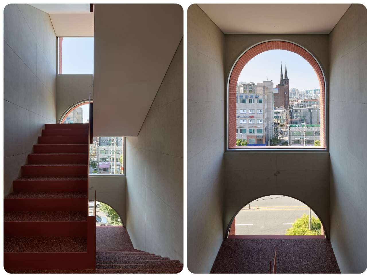낮에는 아치를 통해 들어오는 자연광이 내부를 충분히 채우며, 층이 쌓일수록 깊어지는 아치구조는 처마역할을 하여 내부의 일사량을 조절한다. 사진은 내부 계단 및 창에서 바라보는 외부 풍경 ©사진=노경