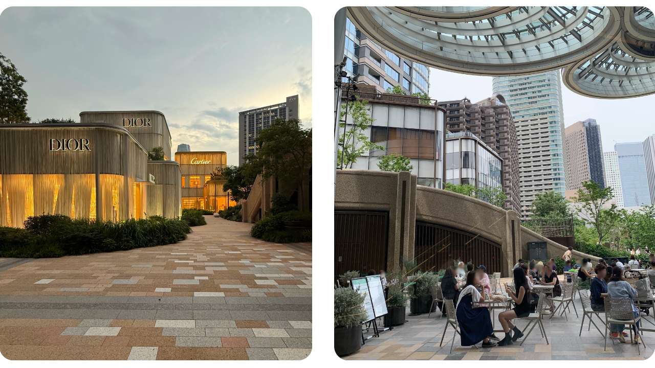 아자부다이 힐스는 리테일과 커뮤니티 기능을 유기적으로 설계해 시장에서 높은 평가를 받는 대표 복합 자산이다. 좌측은 자산의 수준을 가늠하게 하는 리테일 큐레이션. 우측은 야외 공간에서 입주민부터 직장인까지 다양한 공간 이용자들이 머무르고 교류하는 모습. ⒸSPI 플랫폼 마케팅팀