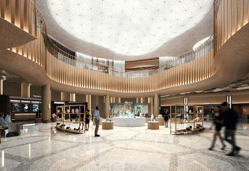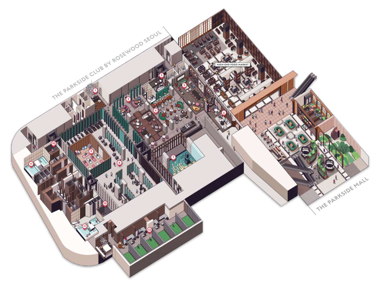 상업시설은 신세계백화점이 2025년 7월 MOU를 체결하고 지하 1층부터 지상 4층까지 16,470㎡를 전면 경영제휴 방식으로 개발합니다. 하이엔드 푸드마켓과 프리미엄 라이프스타일 브랜드로 구성되며, 로즈우드 어메니티와 지하에서 직접 연결되어 주거, 소비, 문화가 유기적으로 융합됩니다.