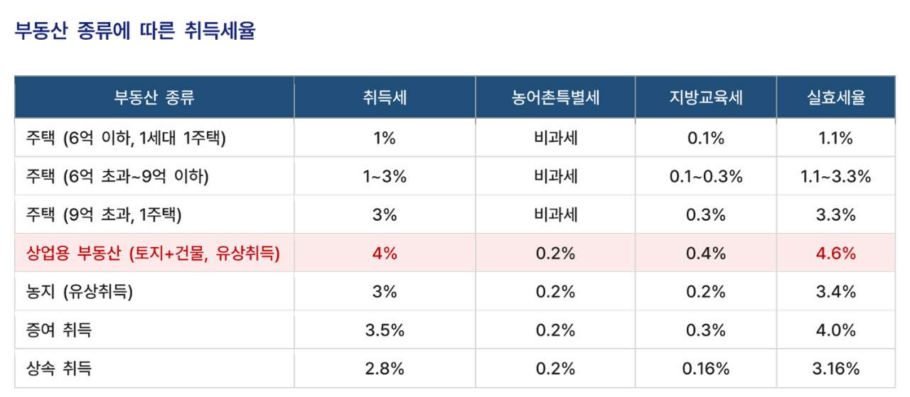 상업용 부동산(오피스·상가·꼬마빌딩 등)의 기본 실효세율은 4.6%로, 30억 원 건물 취득 시 취득세만 약 1억 4천만 원이 발생합니다. 중과요인이 겹치면 이 금액이 두 배 이상 됩니다. 취득세는 지방세이므로 경우에 따라서는 세무사보다 법무사를 통해 해당 지자체에 사전 검토 및 확인을 거칠 필요가 있습니다.