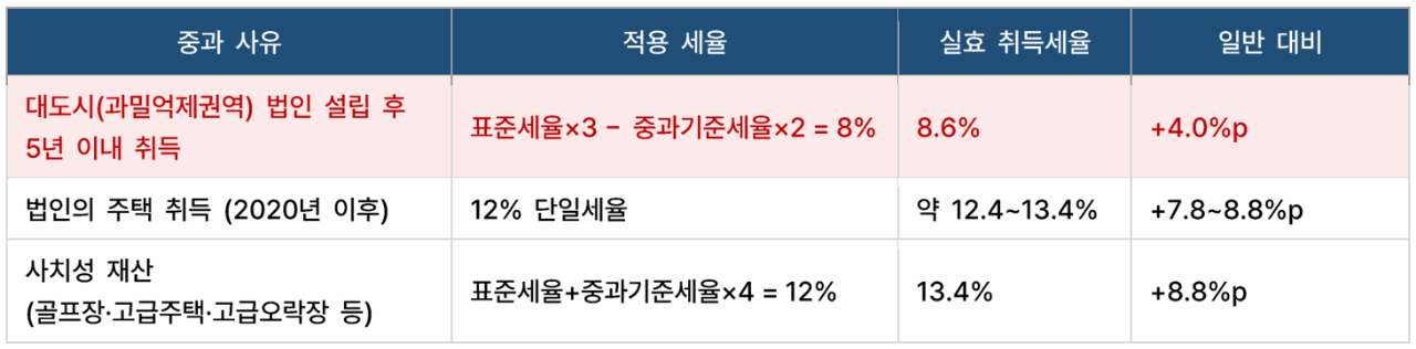 ① 법인(가족법인·SPC) 설립일과 소재지가 과밀억제권역에 해당하는지 ② 취득 물건이 주택인지 상업용인지(법인 주택 취득은 12% 단일세율) ③ 사치성 재산(고급주택 여부) 해당 여부. 이 세 가지를 계약서에 도장 찍기 전에 반드시 세무 전문가와 확인하고 용도변경 등을 통해 중과를 피할 수 있다면 계약서에 이 같은 용도변경 조건을 적시하여 계약한다면 절세가 가능합니다.