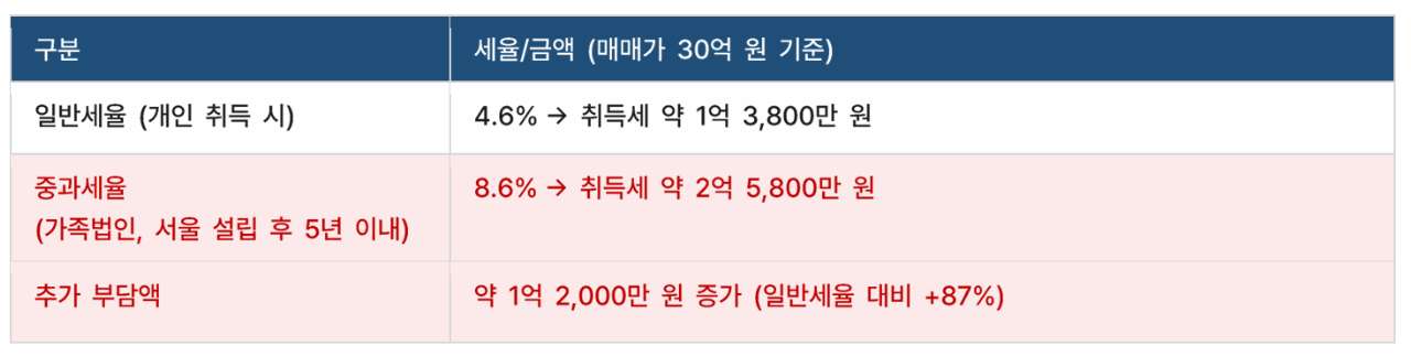 은퇴를 앞둔 P씨는 노후 임대수입과 자녀 자산 이전을 위해 서울에 가족법인(부동산임대업)을 설립하고 마포구 소재 근린상가(매매가 30억 원)를 매입하기로 했습니다. 자녀 2명을 주주로 포함시킨 법인을 서울에 등기한 뒤 2개월 만에 계약을 체결했습니다. 잔금 납부 직전 법무사로부터 취득세 중과 통보를 받았습니다. 서울 내에 법인 본점을 설치하고 5년이 경과하지 않은 상태에서 서울 소재 부동산을 취득하면 「지방세법」 제13조에 따라 중과세율(8%)이 적용되기 때문이었습니다.