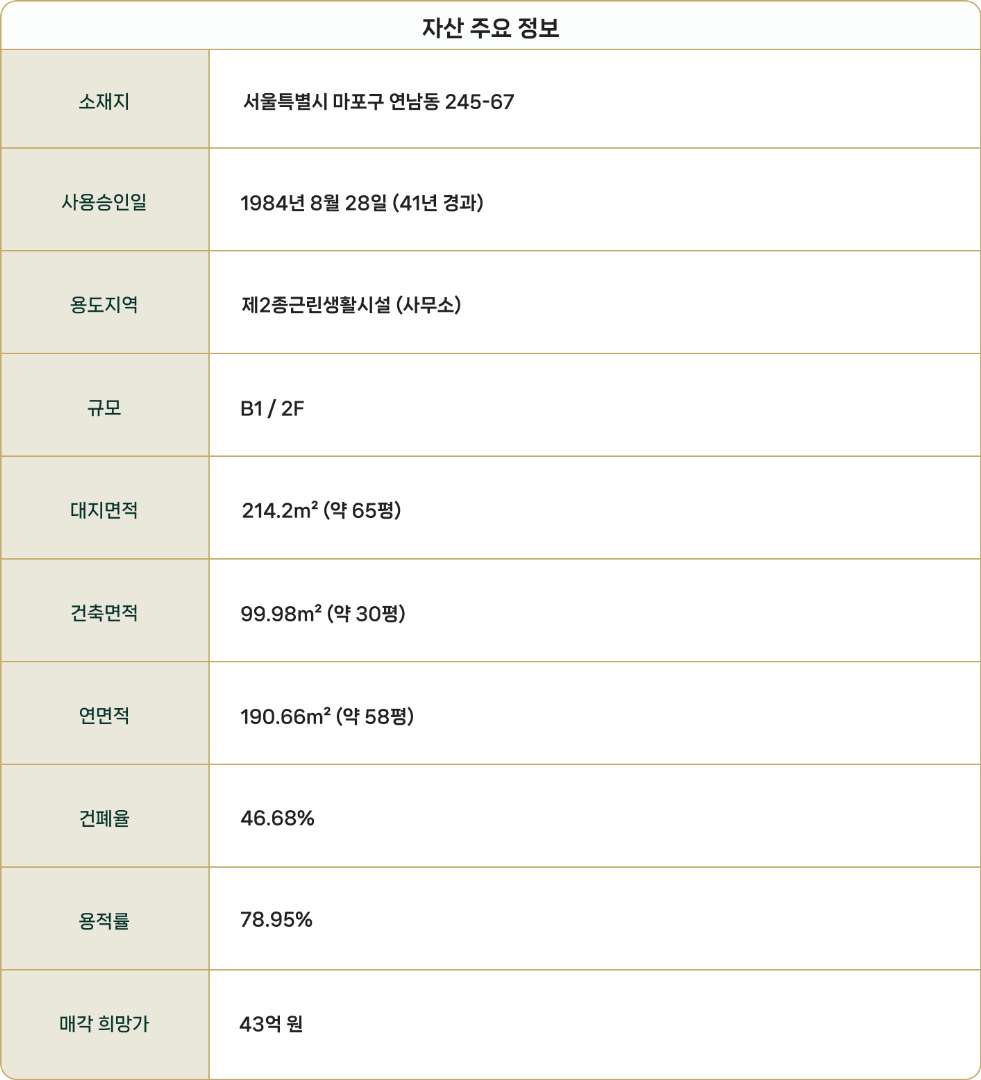 연남동 벚꽃길 북단 끝에 위치한 연남동 245-67번지는 1984년 준공되어 주택으로 사용되다가 근린생활시설로 용도변경되어 카페•공방 등 동네에 걸맞은 업종으로 사용되어 왔습니다.