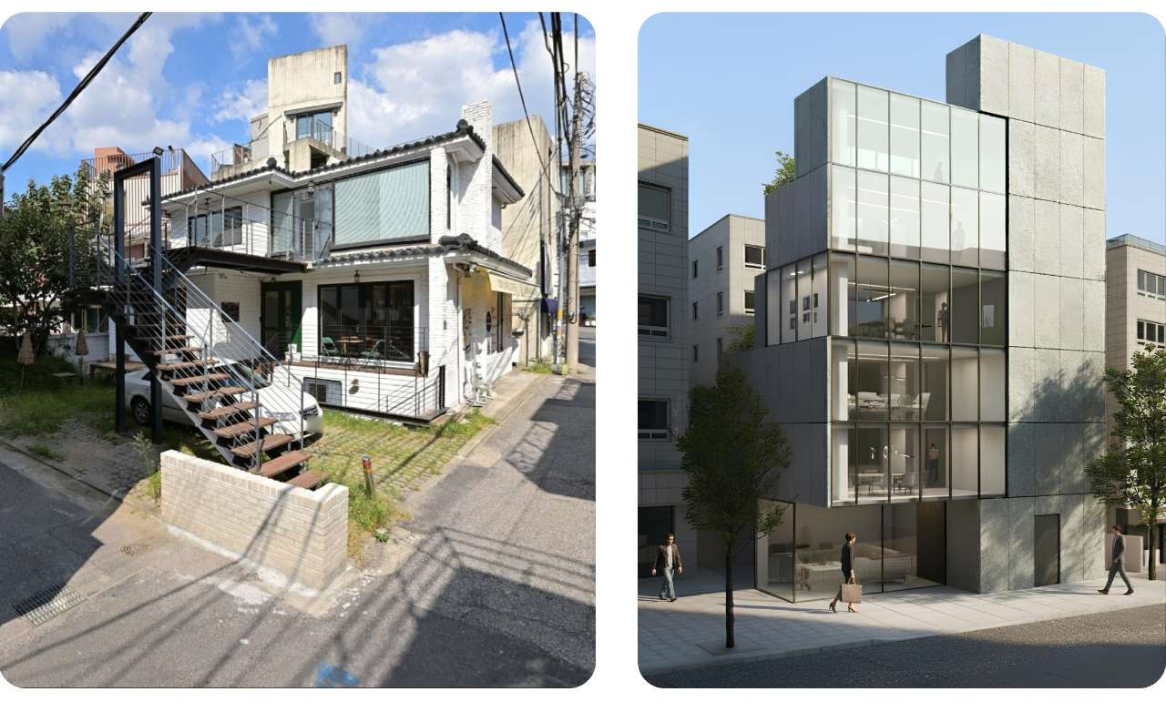 좌측은 현재 연남동 245-67 모습. 우측은 해당 공간 개발 시나리오를 적용한 외부 전경. ⒸJPA