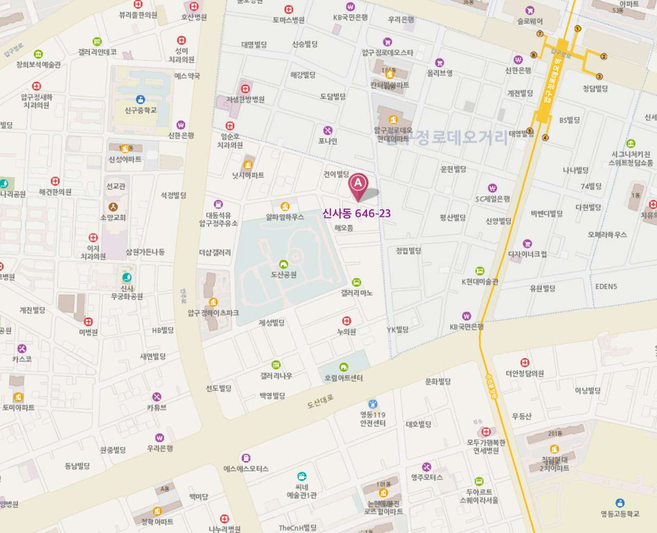 신사동 646-23은 도산공원 상권의 중심축에 위치해있어, 트랜드에 민감한 브랜드를 확보할 수 있는 곳으로 평가되고 있다. Ⓒ배경지도출처=국토정보맵, 국토지리정보원