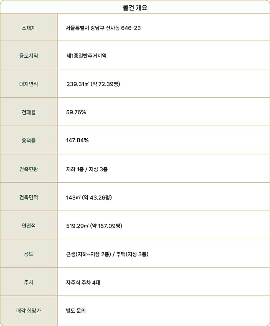 신사동 646-23은 도산공원에서 가장 중심되는 상권 라인에 위치합니다. 대지면적 239.31㎡ (약 72.39평)에 지하 1층~지상 3층 연면적 519.29㎡ (약 157.09평) 규모로 1990년에 준공되었습니다. 향후 리모델링을 통해 경쟁력 있는 부동산으로 가치가 높아질 가능성이 큰 곳입니다.