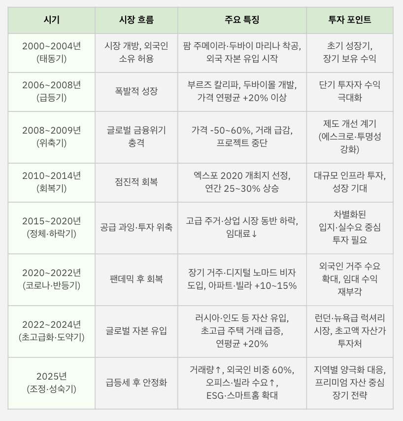 2005년~2007년은 부르즈 할리파 착공과 두바이 몰 공개로 글로벌 럭셔리의 상징으로 부상했으며, 부동산 가격은 연평균 20% 이상 급등했습니다. 그러나 2008년 글로벌금융위기에 따른 두바이 월드의 채무 상환 유예 선언으로 '두바이 쇼크'가 발생하며 가격이 평균 50~60% 하락하기도 했습니다.