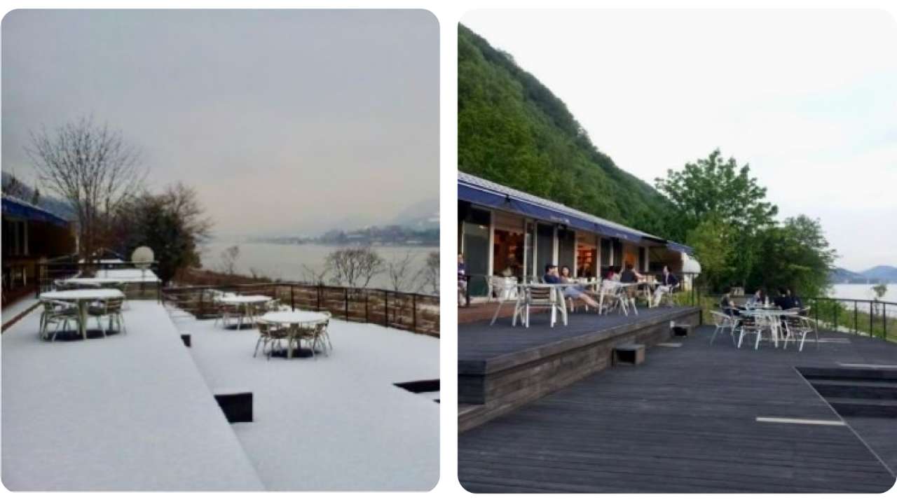 북한강을 따라 위치한 카페의 테라스는 맑은 날이나 눈 오는 날이나 방문자들의 쉼터였다. Ⓒ강종희