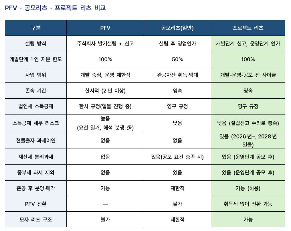 기존 가족법인은 취득세 중과, 법인세 누진 구조, 다주택 종부세 문제에서 자유롭지 않습니다. PFV(프로젝트금융투자회사)는 세제 혜택의 일몰 리스크가 있고, 운영 단계로 전환할 때 별도 리츠를 설립해 자산을 이전해야 하는 구조적 불연속성이 단점이었습니다. 이러한 공백을 메우는 대안으로 설계된 것이 프로젝트 리츠입니다.